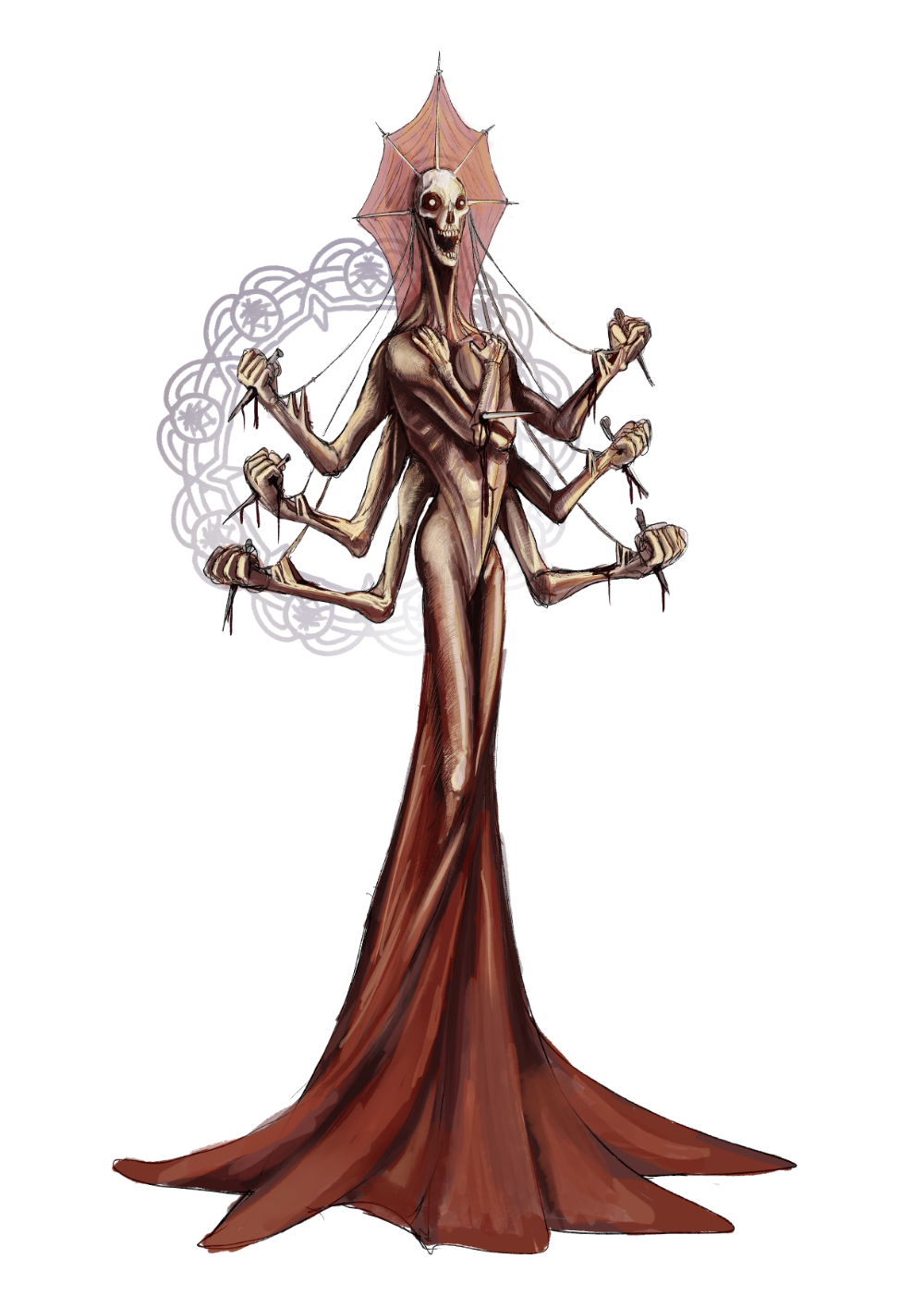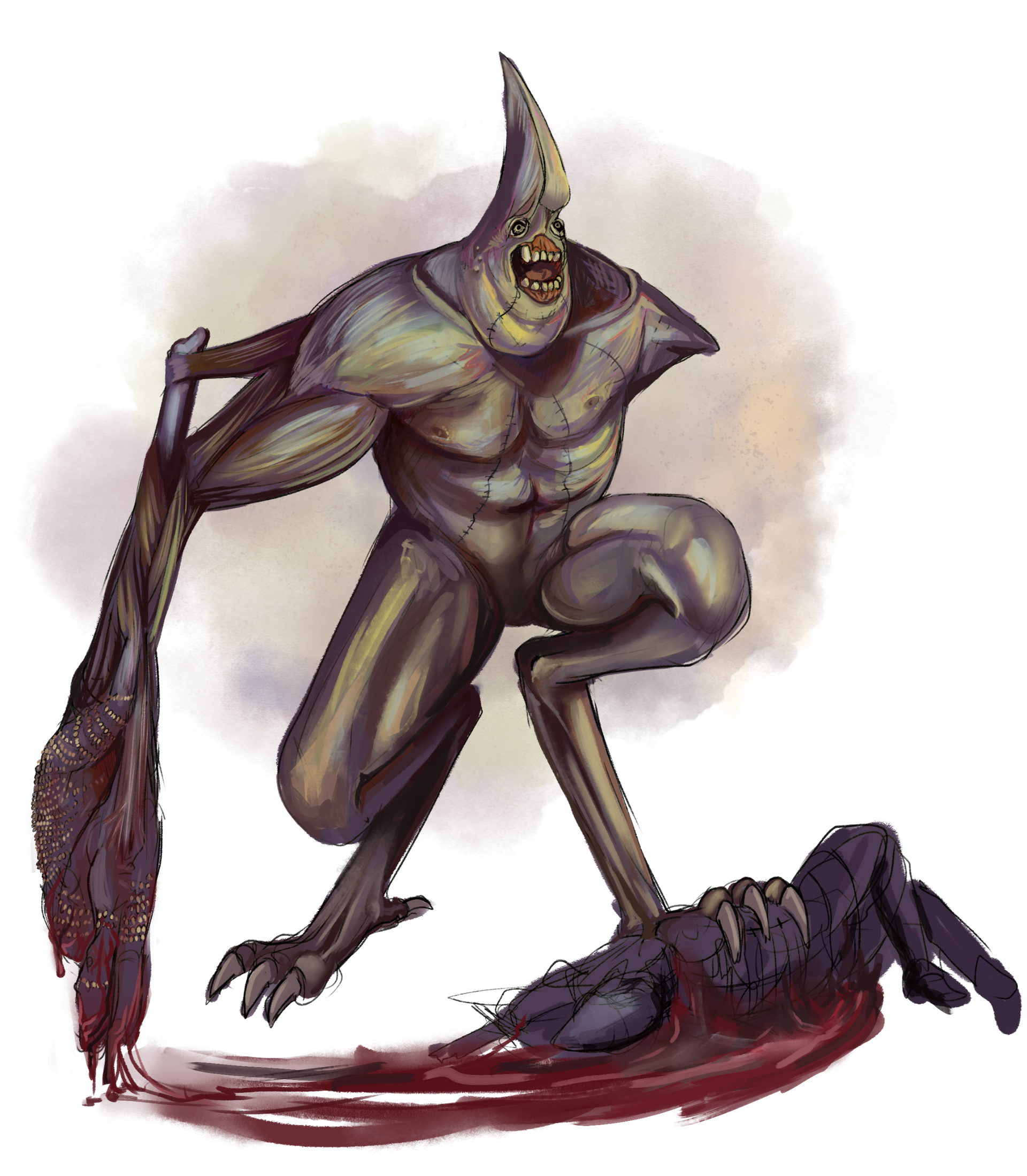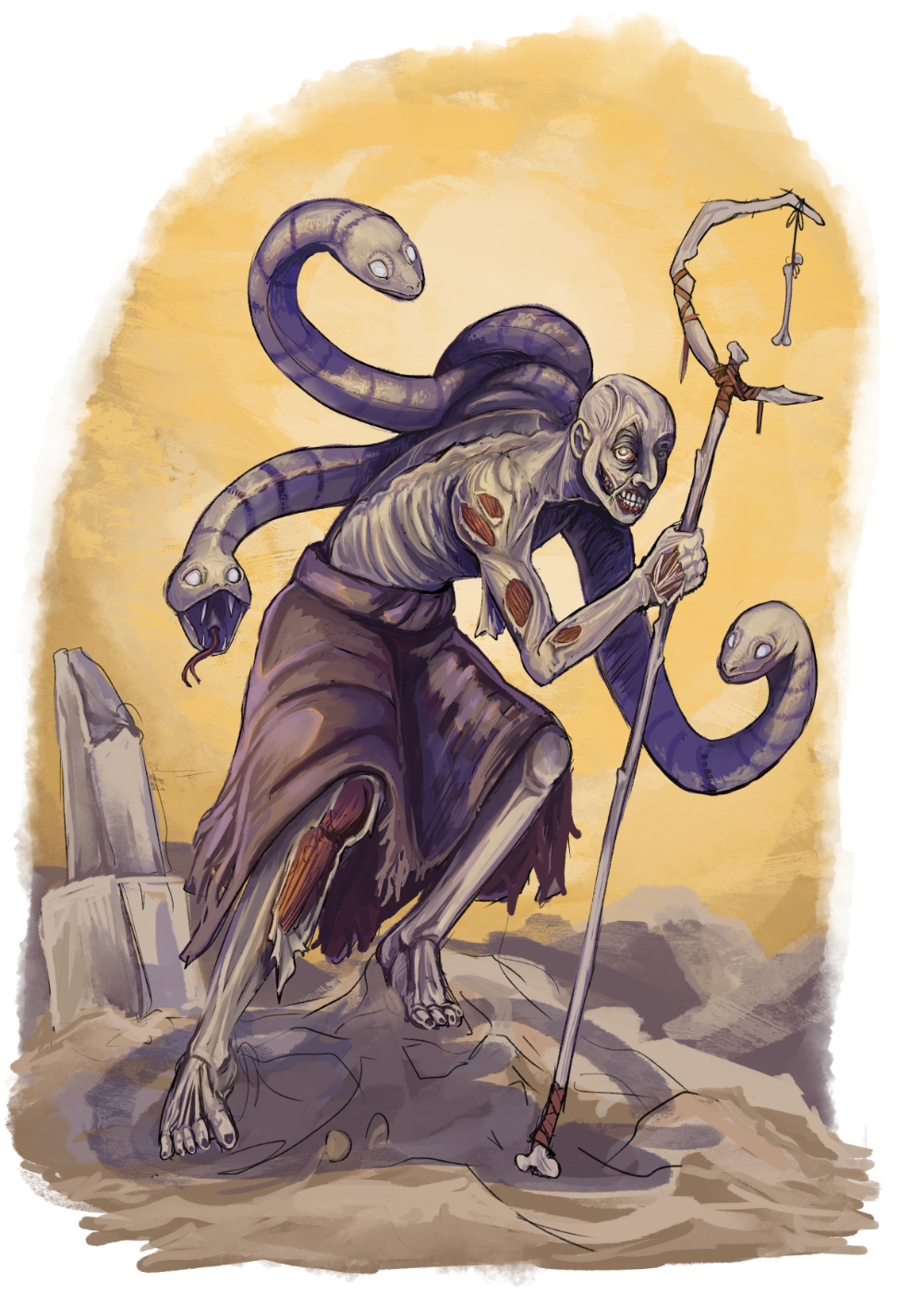 A maioria dos mortos vivos aqui presentes são de um projeto pessoal de RPG intitulado "Eshtiel’s Catalogue of Undead", um catálogo de mortos-vivos para DND 5e.O conceito por trás desse projeto era observá-los a partir de sua anatomia, ver que partes de criaturas diferentes poderiam ser costuradas juntas antes de reanimá-las. Tudo isso sendo descrito e explicado pelo lich que as criou, tentando vendê-las para outros necromantes.Esse projeto, que ainda está em andamento, exigiu que eu montasse as fichas dessas criaturas dentro do sistema, escrevesse sobre elas, produzisse arte, assim como ilustrações menores como se fossem "rascunhos" de seu criador, e diagramasse tudo isso.Por isso, acho interessante ver o resultado completo do trabalho. A seguir, alguns exemplos.
