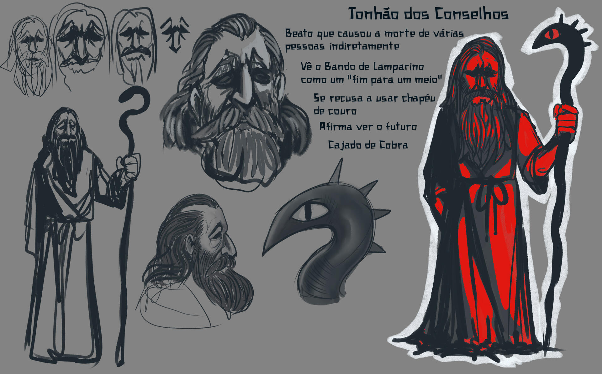 Quanto aos personagens, fui responsável por pintá-los e animá-los. Além disso ajudei no concept do Tonhão dos Conselhos (o velho beato com cajado de cobra).